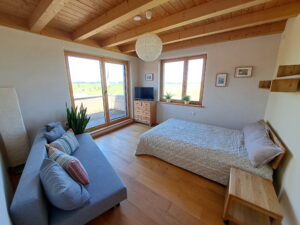 Die Ferienwohnung befindet sich in einem vollkommen ökologisch gebauten Holzhaus (Baujahr 2016). Das gute Raumklima wird durch eine zentrale Lüftungsanlage unterstützt.